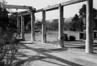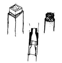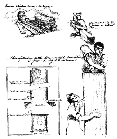 Box columns can be made in many other ways. One kind is made by stacking 8 by 8 inch lightweight concrete blocks, and filling the cavity with a concrete of the same density. Some wire reinforcing inside the column is required to give the column tensile strength. A hollow brick column, filled with earth is another possibility. Concrete, vinyl, and terracotta sewer pipe filled with lightweight concrete and reinforced with mesh; a resin-impregnated cardboard tube filled with earth; or two concentric cardboard tubes with the cuter ring filled with concrete and the inner ring filled with earth; still another is made from a tube of chicken wire mesh, filled with rubble, plastered and whitewashed on the outside. And still another can be made with self-aligning hollow tiles for the skin. The tiles can be molded by hand with a hand press-in concrete or tile; the soft tile will make beautiful rose red, soft warm columns.