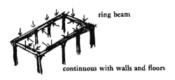 Remember to place reinforcing in such a way that the perimeter beam acts in a horizontal direction as well as vertical. When it forms the base for a Floor-Ceiling Vault (219) it must be able to act as a ring beam to resist all those residual horizontal outward thrusts not contained by the vault. Strengthen the connection between the columns and the perimeter beam with diagonal braces where the columns are free standing Column Connection (227). . . .