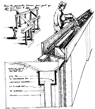 If you conceive and build a room by first placing columns at the corners, and then gradually weaving the walls and ceiling round them, the room needs a perimeter beam around its upper edge. It is the beam, connecting the columns which creates a volume you can visualize, before it is complete; and when the columns are standing in the ground, you need the actual physical perimeter beam, to generate this volume before your eyes, to let you see the room as you are building it, and to tie the tops of the columns together, physically. These reasons are conceptual. But of course, the conceptual simplicity and rightness of the beam around the room comes, in the end, from the more basic fact that this beam has a number of related structural functions, which make it an essential part of any room built as a natural structure. The perimeter beam has four structural functions: 1. It forms the natural thickening between the wall membrane and vault membrane, described in Efficient Structure (206). 2. It resists the horizontal thrust of the ceiling vault, wherever there are no outside external buttresses to do it, and no other vaults to lean against. 3. It functions as a lintel, wherever doors and windows pierce the wall membrane. 4. It transfers loads from columns in upper stories to the columns and the wall membrane below it, and spreads these loads out to distribute them evenly between the columns and the membrane. These functions of the perimeter beam show that the beam must be as continuous as possible with walls and columns above, the walls and columns below, and with the floor. If we follow Good Materials (207), the beam must also be easy to make, and easy to cut to different lengths. Available beams do not meet these requirements. Steel beams and precast or prestressed beams cannot easily be tied into the wall and floor to become continuous with these membranes. Far more important, they cannot easily be cut on site to conform to the exact dimensions of the different rooms which will occur in an organic plan.