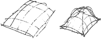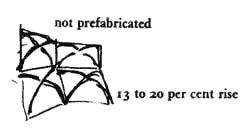 According to the analysis, under such loading the largest compressive stress in this dome occurs near the base at mid points of all four sides and is 120 psi. Outward thrust is the greatest at quarter points along all four walls, and is 1769 pounds. The maximum tension of 32 psi occurs at the corners. Maximum bending is 10 inch pounds per inch. All of these are well within the capacity of the vault, and besides, shrinkage reinforcement in the vault will make it even stronger. The analysis shows, then, that even though the vault is an impure form (it contains square panels which are actually sagging within the overall configuration of the vault shape), its structural behavior is still close enough to that of a pure vault to work essentially as a compression structure. There are small amounts of local bending; and the corner positions of the dome suffer small amounts of tension, but the chicken wire needed for shrinkage will take care of both these stresses. Here are some other possible ways of building such a vault: To begin with, instead of wood for the lattice work, many other materials can be used: plastic strips, thin metal tubes, bamboos. Other resins besides polyester resins can be used to stiffen the burlap. If resins are unavailable, then the form for the vault can be made by placing lattice strips as described, and then stretching chicken wire over it, then burlap soaked in mortar which is allowed to harden before concrete is placed. It might also be possible to use matting stiffened with glue, perhaps even papier mache. It is possible that similar vaults could be formed by altogether different means: perhaps with pneumatic membranes or balloons. And it is of course possible to form vaults by using very traditional methods: bricks or stones, on centering, like the beautiful vaults used in renaissance churches, Gothic cathedrals, and so on. Therefore: Build floors and ceilings in the form of elliptical vaults which rise between 13 and 20 per cent of the shorter span. Use a type of construction which makes it possible to fit the vault to any shaped room after the walls and columns are in position: on no account use a prefabricated vault.
