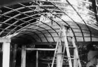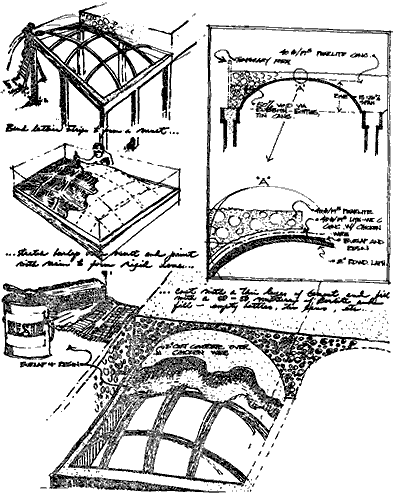 The rest of the vault should not be poured until all edges are in, columns for the next floor are in position, and ducts are insee Box Columns (216), Duct Space (229). In order to keep the weight of the vault down, it is important that even the ultralightweight concrete be further lightened, by mixing it with 50 per cent voids and ducts. Any kind of voids can be used - empty beer cans, wine jugs, sono tubes, ducts, chunks of polyurethane. Or voids can be made very much like the vaults themselves by making arches with latticing between columns and then stretching burlap from these arches to the dome. The drawing below shows the sequence of construction.