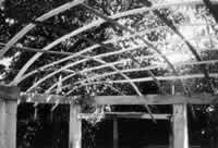 Each of these three vaults makes sense in slightly different circumstances. The first is the easiest to conceive, but it has a slight structural disadvantage: its surface panels are curved in one direction only - because they are made of straight line elements - and cannot therefore achieve the strength of a doubly curved vault. The second is the hardest to conceive; however, it comes naturally from the intersection of a spherical shape and a rectangular one. If one were to make a vault by using a balloon as a form, pushed up within the perimeter beams, the second type would be the easiest to use. In the particular building technique we have been using, the third type is easiest to use, because it is particularly simple to lay out the arched ribs which provide the formwork. It flattens out at the corners, which could create bending moments and require tension materials. However, in lightweight concrete we have found that it does not require any more than the shrinkage reinforcement, which is needed anyway. We shall now describe a very simple way of making a vault. Bear in mind that we considered it essential that the vault be built up gradually, and that it could be fitted to any room shape, without difficulty. This technique is not only cheap and simple. It is also one of the only ways we have found of fitting a vault to an arbitrary room shape. It works for rectangular rooms, rooms that are just off-rectangles, and odd-shaped rooms. It can be applied to rooms of any size. The height of the vault can be varied according to its position in the overall array of ceiling heights and floors - Ceiling Height Variety (190), Structure Follows Social Spaces (205), Floor and Ceiling Layout (210). First, place lattice strips at one foot centers, spanning in one direction, from one perimeter beam to the opposite perimeter beam, bending each strip to make a sensible vault shape. Now weave strips in the other direction, also at almost one foot centers, to form a basket. The strips can be nailed onto the form of the perimeter beam around the room. You will find that the basket is immensely strong and stable.