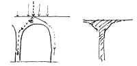 Rectangular frames, especially, have these cracks at the corners because the transmission of the load is discontinuous there. To solve this problem the frame must be braced - made into a rigid frame that transmits the forces around it as a whole without distorting. The bracing is required at any right-angled corner between columns and beams or in the corners of door and window frames. 2. A column connection as a capital. This happens most effectively in an arch. The arch creates a continuous body of compressive material, which transfers vertical forces from one vertical axis to another. It works effectively because the line of action of a vertical force in a continuous compressive medium spreads out downward at about 45 degrees. And a column capital is, in this sense, acting as a small, underdeveloped arch. It reduces the length of the beam - and so reduces bending stress. And it begins to provide the path for the forces as they move from one vertical axis to another, through the medium of the beam. The larger the capital, the better.