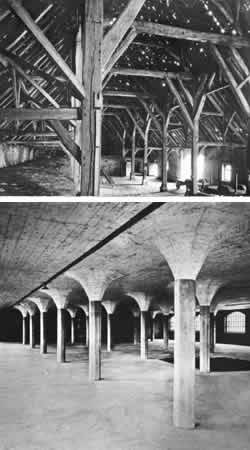A similar column connection can be made integral with poured hollow columns and beams. The forms for the connection are gussets made of skin material: then fill the column and the gussets and the beam in a continuous concrete pour. Of all the patterns in the book, this is one of the most widespread and has taken the greatest variety of outward forms throughout the course of history. A solid wood capital on a wood column, or a continuously poured column top, and arches of stone, brick, or poured concrete are all examples. And, of course, typical column capitals - a larger stone on a stone column or typical gusset plate or brace - even if weak in some ways, also help a great deal. But only relatively few of the historical column connections succeed fully in acting both as braces and as capitals. Therefore: Build connections where the columns meet the beams. Any distribution of material which fills the corner up will do: fillets, gussets, column capitals, mushroom column, and most general of all, the arch, which connects column and beam in a continuous curve.