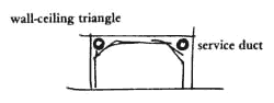 | 229 Duct Space . . . in a building built according to the principle, of Efficient Structure (206) and built with vaulted floors - Floor-Ceiling Vaults (219), there is a triangular volume, unused, around the edge of every room. This is the most natural place to put the ducts.