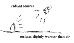 This pattern is a biologically precise formulation of the intuition that sunlight and a hot blazing fire are the best kinds of heat. Heat can be transmitted by radiation (heat waves across empty space), convection (flow in air or liquids by mixing of molecules and hot air rising), and conduction (flow through a solid). In most places, we get heat in all three ways from our environment: conducted heat from the solids we touch, convected heat in the air around us, and radiated heat from those sources of radiation in our line of sight. Of the three, conducted heat is trivial, since any surface hot enough to conduct heat to us directly is too hot for comfort. As far as the other two are concerned - convected heat and radiant heat - we may ask whether there is any biological difference in their effects on human beings. In fact there is. It turns out that people are most comfortable when they receive radiant heat at a slightly higher temperature than the temperature of the air around them. The two most primitive examples of this situation are: (1) Outdoors, on a spring day when the air is not too hot but the sun is shining. (2) Around an open fire, on a cool evening. Most people will recognize intuitively that these are two unusually comfortable situations. And in view of the fact that we evolved as organisms in the open air, with plenty of sun, it is not surprising that this condition happens to be so comfortable for us. It is built into our systems, biologically. Unfortunately, it happens that many of the most widely used heating systems ignore this basic fact. Hot air systems, and buried pipes, and the so-called hot water "radiators" do transmit some of their heat to us by means of radiation, but most of the heat we get from them comes from convection. The air gets heated and warms us as it swirls around us. But, as it does so it creates that very uncomfortable stuffy, over-heated, dry sensation. When convection heaters are warm enough to heat us we feel stifled. If we turn the heat down, it gets too cold. The conditions in which people feel most comfortable require a subtle balance of convected heat and radiant heat. Experiments have established that the most comfortable balance between the two, occurs when the average radiant temperature is about two degrees higher than the ambient temperature. To get the average radiant temperature in a room, we measure the temperature of all the visible surfaces in a room, multiply the area of each surface by its temperature, add these up, and divide by the total area. For comfort, this average radiant temperature needs to be about two degrees higher than the air temperature. Since some of the surfaces in a room (windows and outside walls), will usually be cooler than the indoor air temperature, this means that at least some surfaces must be considerably warmer to get the average up. An open fire, which has a small area of very high temperature, creates this condition in a cool room. The beautiful Austrian and Swedish tiled stoves also do it very well. They are massive stoves, made of clay bricks or tiles, with a tiny furnace in the middle. A handful of twigs in the furnace give all their heat to the clay of the stove itself, and this clay, like the earth, keeps this heat and radiates it slowly over a period of many hours.