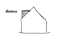 We know from our discussion of Sheltering Roof (117) that the top story of the building should be right inside the roof, surrounded by it. Obviously, if there is habitable space inside the roof, it must have some kind of windows; skylights are not satisfactory as windows - except in studios or workshops - because they do not create a connection between the inside and the outside world - Windows Overlooking Life (192). It is therefore natural to pierce the roof with windows; in short, to build dormer windows. This simple, fundamental fact would hardly need mentioning if it were not for the fact that dormer windows have come to seem archaic and romantic. It is important to emphasize how sensible and ordinary they are - simply because people may not build them if they believe that they are old fashioned and out of date. Dormers make the roof livable. Aside from bringing in light and air and the connection to the outside, they relieve the low ceilings along the edge of the roofs and create alcoves and window places. How should the dormers be constructed? Within the roof vault we have described, the basket which forms the vault can simply be continued to form the roof of the dormer, over a frame of columns and perimeter beams which form the opening. The other ways of building dormer windows depend on the construction system you are using. Whatever you are using for lintels, columns, and walls, can simply be modified and used in combination to build the dormer Therefore: Wherever you have windows in the roof, make dormer windows which are high enough to stand in, and frame them like any other alcoves in the building.