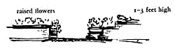 Look at the positions that wildflowers take in nature. They are as a rule in protected places when they occur in massive quantities: places away from traffic - often on grassy banks, on corners of fields, against a wall. It is not natural for flowers to grow in bundles like flower beds; they need a place to nestle. What are the issues? 1. The sun - they need plenty of sun. 2. A position where people can smell and touch them. 3. Protection from stray animals. 4. A position where people see them, either from inside a house or along the paths which they naturally pass coming and going. Typical flower borders are often too deep and too exposed. And they are so low the flowers are out of reach. Concrete planter boxes made to protect flowers often go to the other extreme. They are so protected that people have no contact with them ' except from a distance. This is next to useless. The flowers need to be close, where you can touch them, smell them. Therefore, instead of putting the flowers in low borders, on the ground, where people walk, or in massive concrete tubs, build them up in low beds, with sitting walls beside them, along the sides of paths, around entrances and edges. Make quite certain that the flowers are placed in positions where people really can enjoy them - and not simply as ornament: outside favorite windows, along traveled paths, near entrances and round doorways, by outdoor seats.