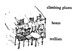 A building finally becomes a part of its surroundings when the plants grow over parts of it as freely as they grow along the ground. There is no doubt that buildings with roses or vines or honeysuckle growing on them mean much more to us than buildings whose walls are blank and bare. That is reason enough to plant wild clematis around the outside of a building, to make boxes to encourage plants to grow at higher stories, and to make frames and trellises for them to climb on. We can think of four ways to ground this intuition in function. 1. One argument, consistent with others in the book, is that climbing plants effect a smooth transition between the built and the natural. A sort of blurring of the edges. 2. The quality of light. When the plants grow around the openings of buildings, they create a special kind of filtered light inside. This light is soft, reduces glare, and stark shadows - Filtered Light (238). 3. The sense of touch. Climbing and hanging plants also give the outside walls a close and subtle texture. The same kind of texture can be achieved in the building materials, but it is uniquely beautiful when it comes from a vine growing across a wall or winding around the eaves of an arcade. Then, the texture invites you to touch and smell it, to pick off a leaf. Perhaps most important, the texture of climbing plants is ever different; it is subtly different from day to day, as the wind and sun play upon it; and it is greatly different from season to season. 4. Tending the plants. When they are well-tended, healthy plants and flowers growing around the windows and out of flower boxes in the upper stories, make the street feel more comfortable. They bespeak a social order of some repose within the buildings, and therefore it is comfortable to be on the streets - one feels at home. It is as if the plants were a gift from the people inside to people on the street.
