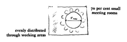 The meeting rooms are not located where people work. Once again, this discrepancy has a bad effect on the social life of small meetings. The meetings work best when the meeting rooms are fairly near the participants' offices. Then discussions which begin in the meeting rooms are able to continue in the office or laboratory. When the meeting rooms are a long walk from offices, the chances of this kind of informal business are drastically reduced. Therefore: Make at least 70 per cent of all meeting rooms really small - for 12 people or less. Locate them in the most public parts of the building, evenly scattered among the workplaces.
