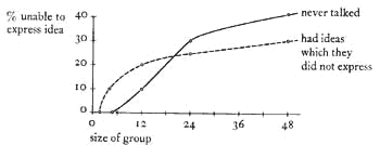 The larger meetings are, the less people get out of them. But institutions often put their money and attention into large meeting rooms and lecture halls. We first discuss the sheer size of meetings. It has been shown that the number of people in a group influences both the number who never talk, and the number who feel they have ideas which they have not been able to express. For example, Bernard Bass (Organizational Psychology,Boston: Allyn, 1965, p. 200) has conducted an experiment relating group size to participation. The results of this experiment are shown in the following graph.