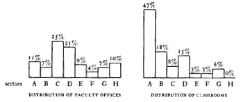We found that the meetings of official committees, boards, and commissions in the City of Berkeley have a similar distribution. Among the various city boards, commissions, and committees, 73 per cent have an average attendance of 15 or less. Yet of course, most of these meetings are held in rooms designed for far more than 15 people. Here again, most of the meetings are held in rooms that are too large; the rooms are half-empty; people tend to sit at the back; speakers face rows of empty seats. The intimate and intense atmosphere typical of a good small meeting cannot be achieved under these circumstances. Finally, the spatial distribution of meeting rooms is often as poorly adapted to the actual meetings as the size distribution. The following histograms compare the distribution of classrooms in different sectors of the University of Oregon with the distribution of faculty and student offices.
