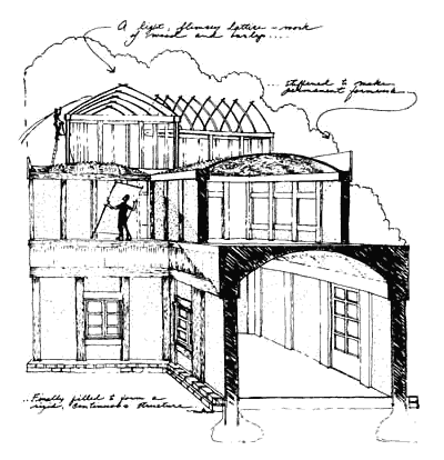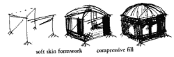 The drawing above, shows one particular realization of this kind of gradual stiffening. But the principle is far more general than this particular use of it. Indeed, it occurs, in one way or another, in almost all traditional forms of building. Eskimo igloo construction and African basket structures are both gradually stiffened structures, where each next step copes with the existing framework, adds to it, and stiffens it. The stone buildings of Alberobello in southern Italy are examples. So is Elizabethan halftimber construction. Therefore: Recognize that you are not assembling a building from components like an erector set, but that you are instead weaving a structure which starts out globally complete, but flimsy; then gradually making it stiffer but still rather flimsy; and only finally making it completely stiff and strong. We believe that in our own time, the most natural version of this process is to put up a shell of sheet materials, and then make it fully strong by filling it with a compressive fill.